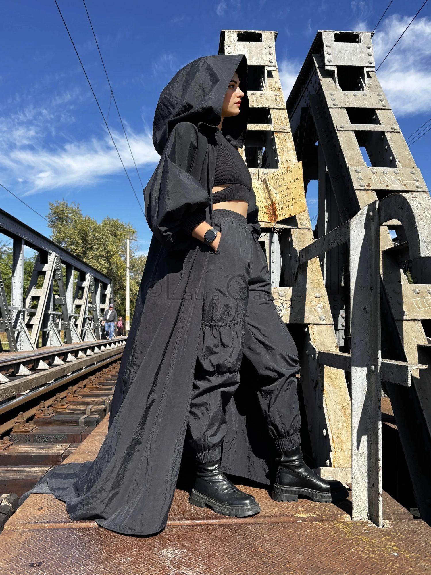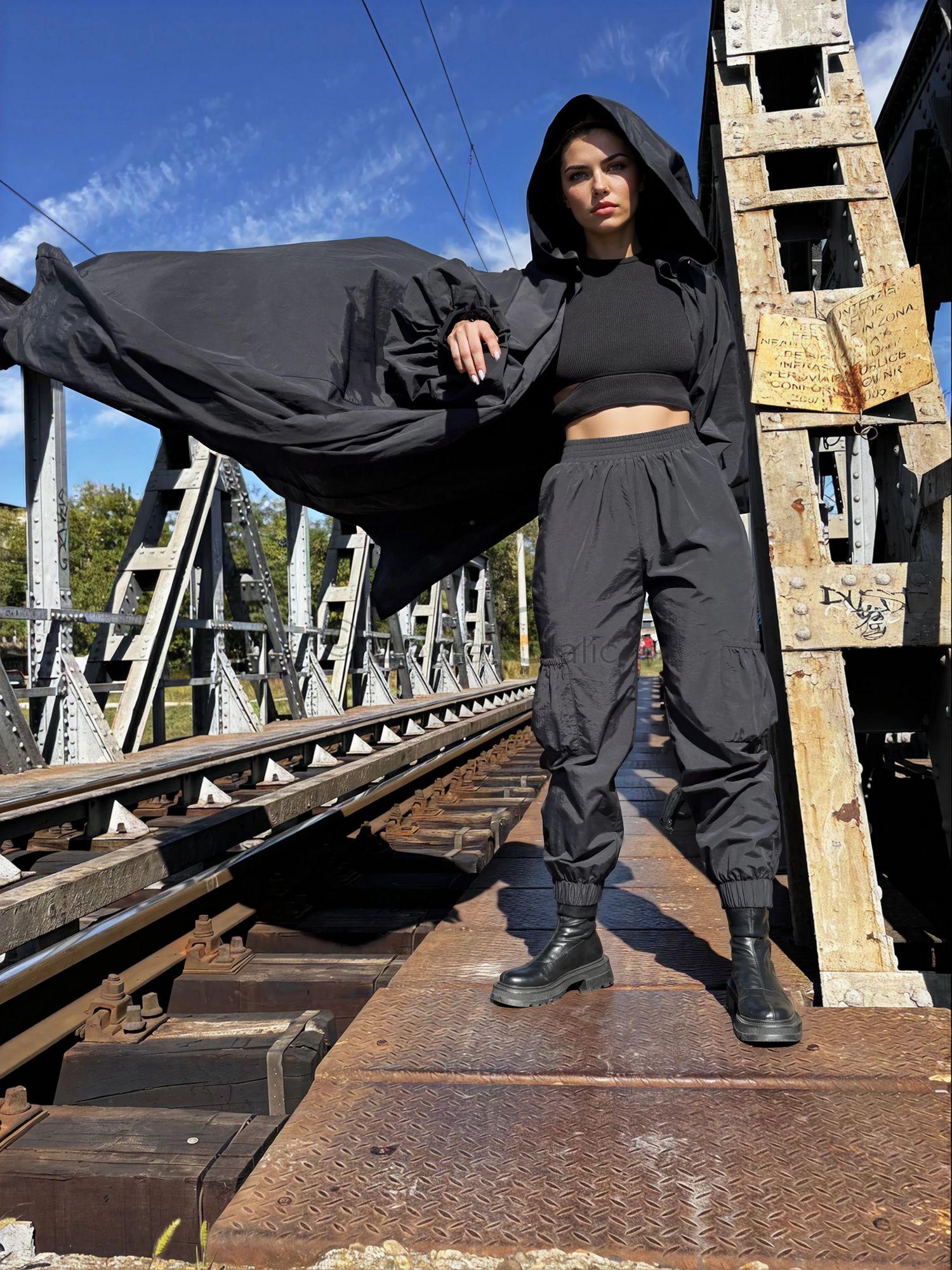 Cargo gothic-chic trousers, memory taffeta, elastic waist band , 4 side pockets
